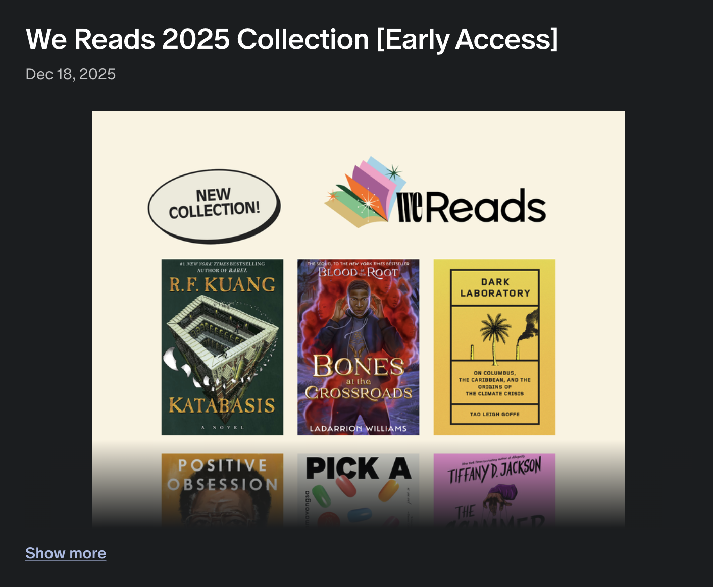 We Reads 2025 Collection [Early Access] – Patreon and Seed Circle members get early access to things like We Reads collection drops, which include lists of must-read, watch, and listen to books and media.